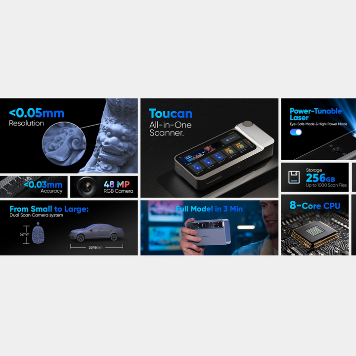 3DMakerpro Toucan is an all-in-one 3D scanner that combines highest precision with easy operation. Thanks to integrated storage, powerful CPU, and innovative MEMS optics, you do not need a computer – scanning, editing, and meshing are done directly on the device.