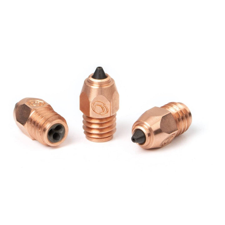 Die CHT®-Düsen teilen das Filament in drei dünne Stränge auf, wodurch es von innen heraus schneller aufschmilzt. Das ermöglicht deutlich höhere Durchflussraten und kürzere Druckzeiten. Die Nickelbeschichtung reduziert zudem das Anhaften von Filament und schützt die Oberfläche vor Korrosion.