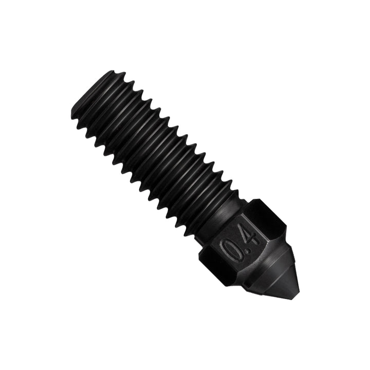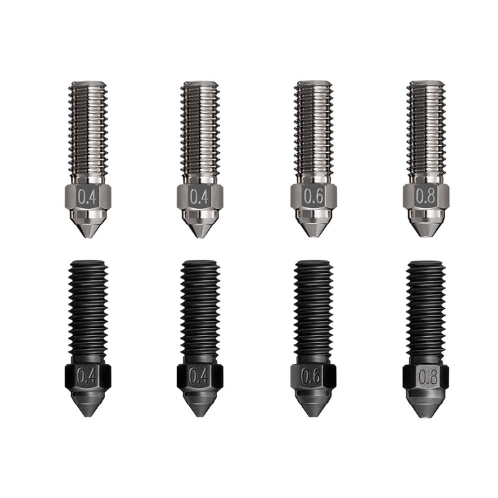 Die Düsen bestehen aus einer Kupferlegierung mit hoher Wärmeleitfähigkeit von bis zu 330 W/m.k, was eine gleichmäßige Erwärmung garantiert. Die Düse hat ein Volumen, das doppelt so groß ist wie das gewöhnlicher Düsen, und unterstützt hohe Druckgeschwindigkeiten von bis zu 600 mm/s. Eine gleichmäßige Nickelbeschichtung reduziert die Haftung von Filamenten und sorgt für eine glattere Extrusion. Die gehärtete Stahlkonstruktion bietet hohe Härte, bessere Abriebfestigkeit und eine längere Lebensdauer. Zudem ist die Düse gegen Korrosion resistent, was ihre Haltbarkeit weiter erhöht.
