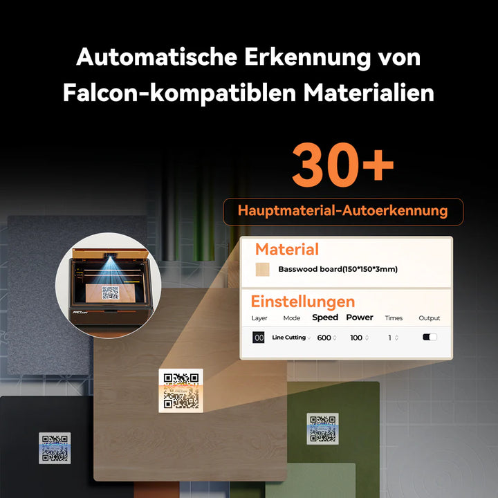 With the integrated camera and an automatic QR code recognition system, the Falcon A1 independently detects the material used and automatically adjusts the settings. No more manual testing or adjusting – just insert the workpiece and start.