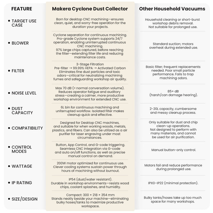 Der Makera Cyclone Dust Collector ist eine leistungsstarke, industrietaugliche Absauglösung für moderne CNC-Systeme. Mit seinem hocheffizienten Zyklon-System, automatischer Steuerung und flüsterleisem Betrieb sorgt er für eine saubere, sichere und produktive Arbeitsumgebung – vom Makerspace bis zur professionellen Fertigung.
