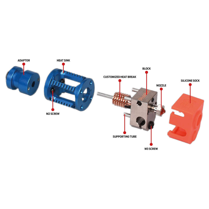 - Der Hot-End besteht hauptsächlich aus Kupferlegierung, die eine schnellere Erwärmung und bessere Wärmeableitung bietet.