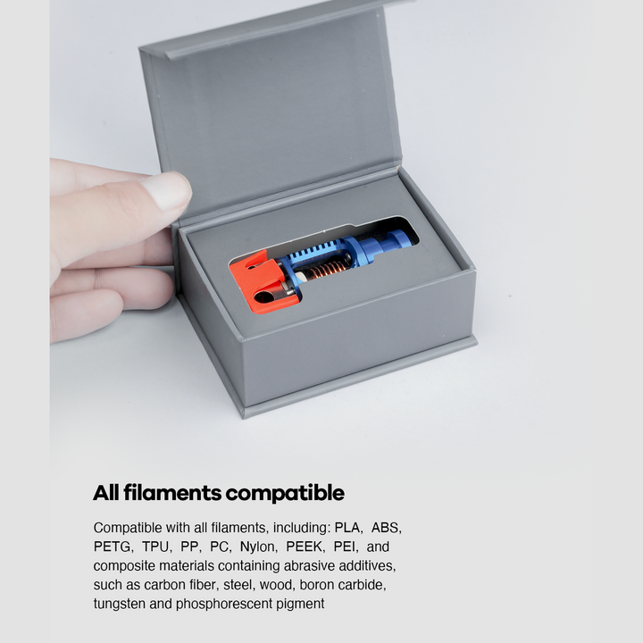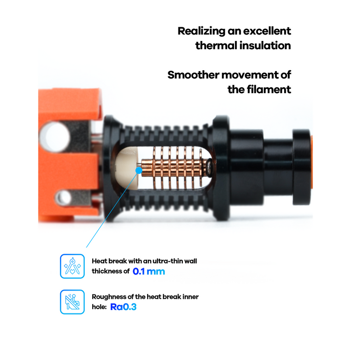 - Die Innenrauhigkeit der Düse und des Heat Breaks beträgt Ra 0,4, was eine reibungslosere Bewegung des Filaments ermöglicht und zu höher auflösenden Drucken führt.