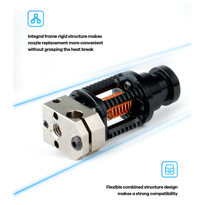 - Integrierte Rahmenstruktur erleichtert den Austausch der Düse, ohne den Heizblock greifen zu müssen.