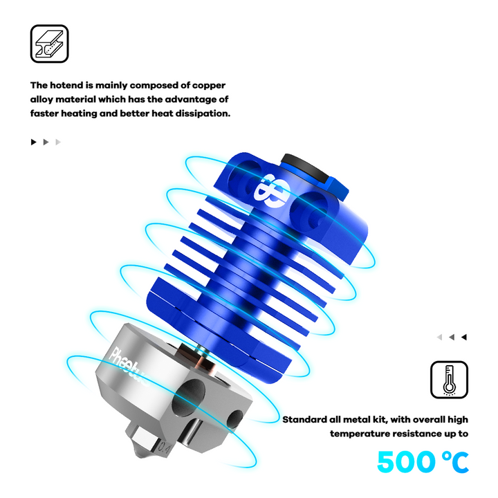 - Geeignete Materialien: Kompatibel mit allen Filamenten, einschließlich PLA, ABS, PETG, TPU, PP, PC, Nylon, PEEK, PEI und Verbundmaterialien mit abrasiven Zusätzen wie Kohlenstofffaser, Stahl, Holz, Borcarbid, Wolfram und phosphoreszierenden Pigmenten.