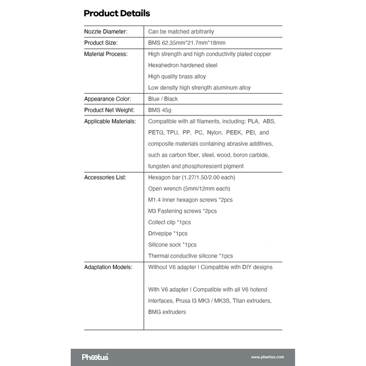 Hier sind einige technische Spezifikationen des Phaetus Dragonfly Hot-End BMS: