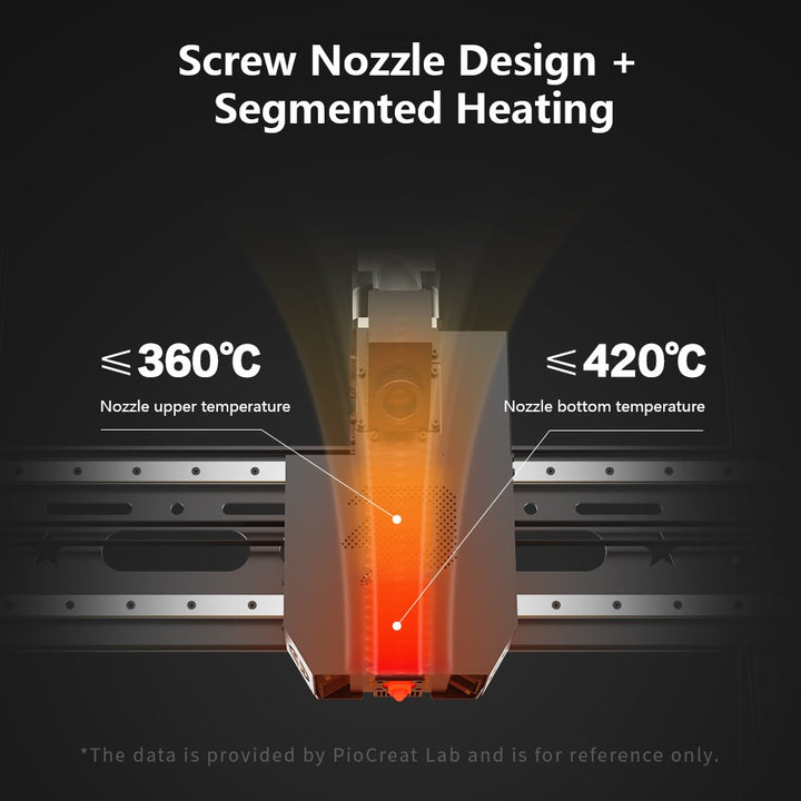 Der neu entwickelte Hochtemperatur-Extruder ist mit mehrsegmentigen Heizzonen ausgestattet und kann Düsen von 0,4 mm bis 3 mm Durchmesser aufnehmen.
