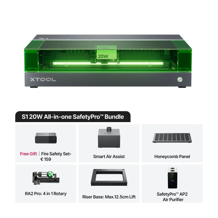 - No Bundle: xTool S1 (20W), Abluftschlauch, Stromkabel, USB-Kabel, Handbuch