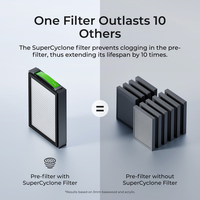 Das Herzstück des AP2 ist das 6-Layer-Filtersystem, das die Luft reinigt, indem es Staub, Allergene und schädliche Dämpfe erfasst. Das System umfasst den SuperCyclone-Filter für große Partikel, einen Filter mit mittlerer Effizienz für feinen Staub und ein ultra-dichtes Kohlenstoffnetz, das Gerüche und VOCs mit einer Effizienz von 99,99 % beseitigt. Trotz seiner leistungsstarken Filtrationsfähigkeiten arbeitet der xTool SafetyPro AP2 mit nur 55 dB, was ihn ideal für Wohn- oder Büroumgebungen macht, in denen Geräuschpegel minimiert werden müssen.